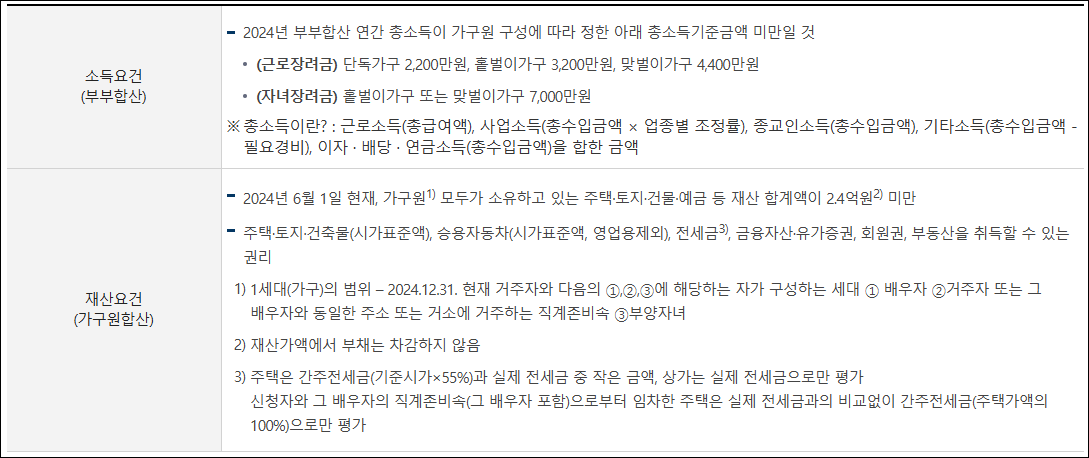 • 2024년 6월 1일 기준, 가구원 모두의 재산 합계액이 2억 4천만 원 미만이어야 합니다.